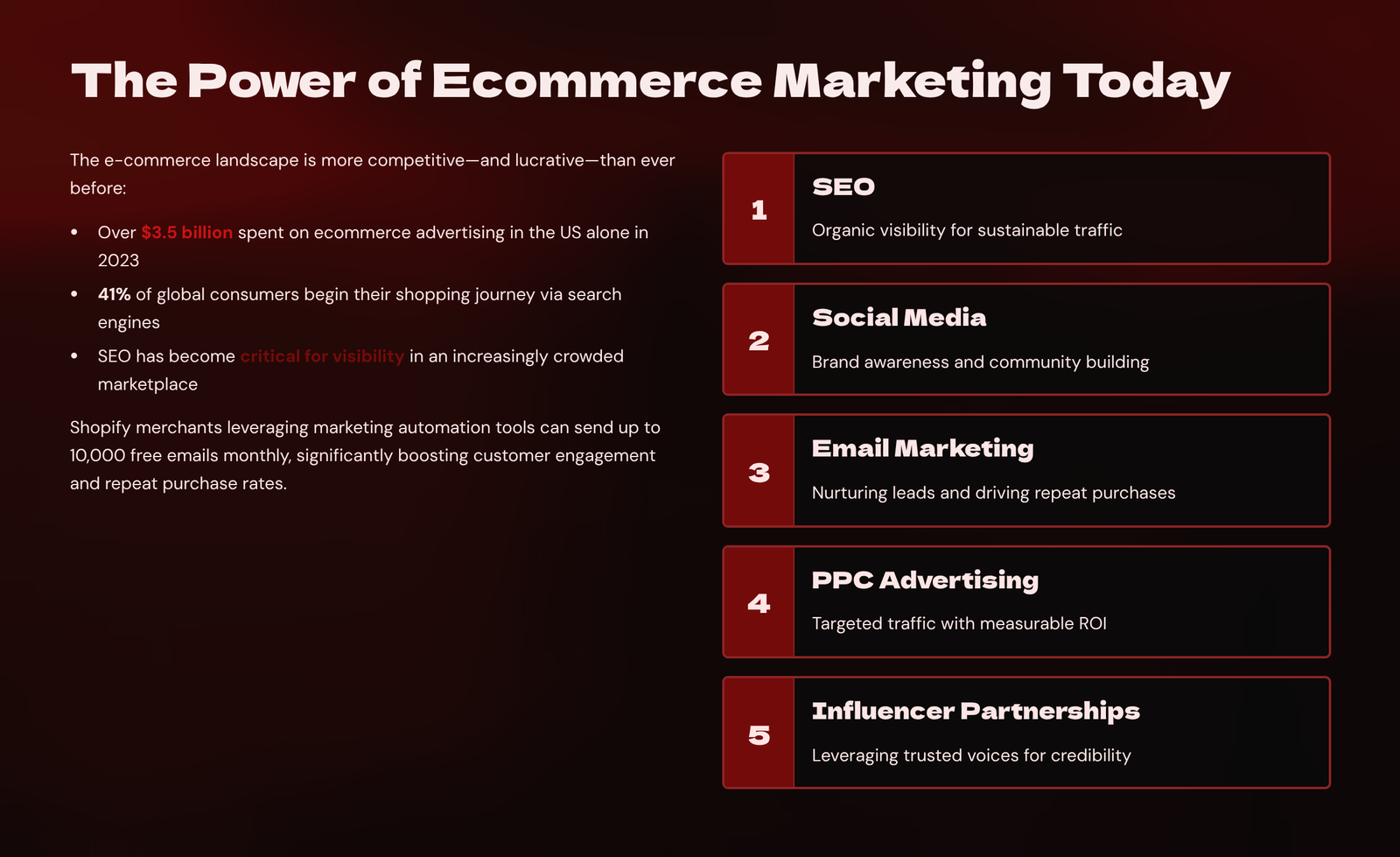 Email remains one of the highest ROI channels in e-commerce, especially when powered by automation. Start with core flows: welcome series, post-purchase follow-ups, abandoned cart recovery, browse abandonment, and win-back campaigns. For instance, a first-time buyer might receive an order confirmation, followed by care tips, a product review request, and a discount for their second order. Segment your list by purchase behaviour, interest, or engagement level to send tailored offers—e.g., VIP customers get early access, dormant customers get reactivation campaigns. Weekly promotional emails or product spotlights keep your brand top-of-mind. Use catchy subject lines, responsive design, and clickable visuals. Always include a CTA and track open/click/purchase rates. Tools like Klaviyo, Mailchimp, and Omnisend offer drag-and-drop automation builders, advanced segmentation, and real-time revenue tracking. Consistent email marketing builds trust, urgency, and ongoing engagement, all without needing to pay for more traffic.