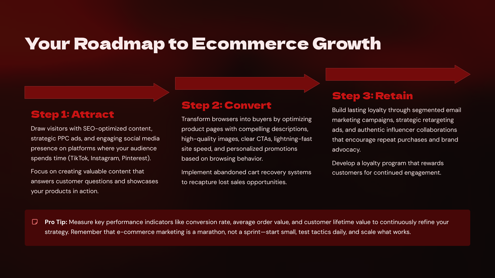Google Shopping and Performance Max campaigns help you target bottom-of-funnel users searching specific items. TikTok and Pinterest ads can also be effective for visual or trend-based products. Always track ROAS (Return on Ad Spend) and adjust campaigns based on real-time performance. Creatives should be thumb-stopping, mobile-optimised, and include clear CTAs and benefits. Successful e-commerce advertising combines targeting precision, compelling visuals, and a well-optimised landing page. Without these, even large budgets won’t convert. With them, you can scale profitably and predictably.
