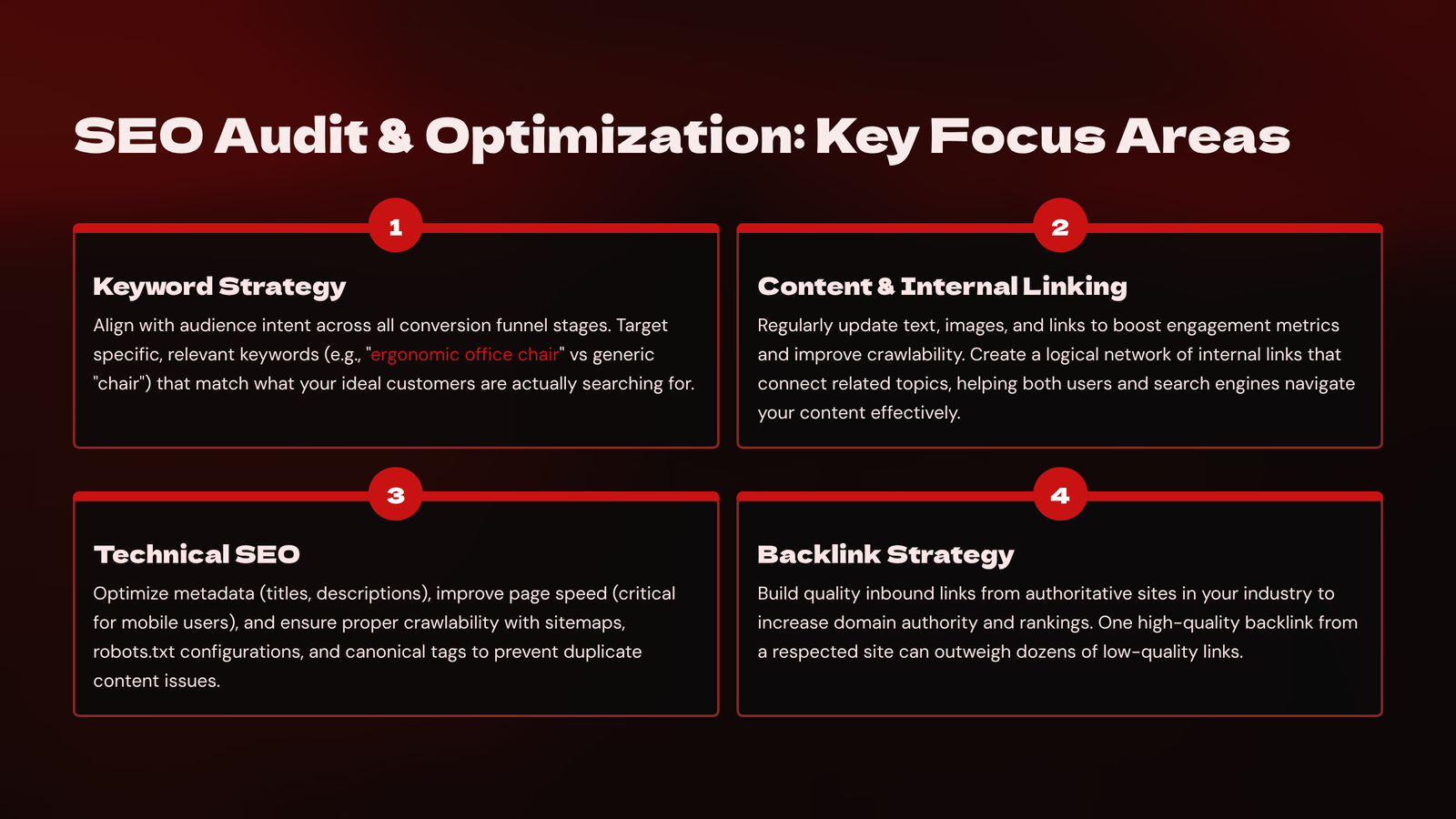 Keyword research is the cornerstone of effective SEO. It involves identifying the exact words and phrases your potential customers type into Google when looking for products, services, or information. These keywords help you shape your website content, blog posts, meta descriptions, and headlines to match user intent. For instance, someone typing ā€œaffordable digital marketing for small businessesā€ is likely looking for budget-friendly solutions—this keyword tells you what content to create and what language to use. Keywords fall into different categories: short-tail (e.g., ā€œSEOā€), long-tail (e.g., ā€œhow to improve SEO for a local coffee shopā€), navigational (brand-based), informational (how-to queries), and transactional (intent to purchase).