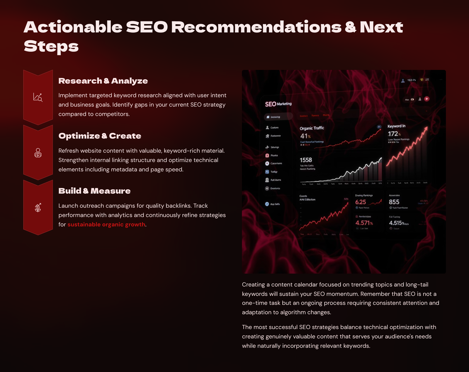 SEO is a long-term game, but it must be data-driven. Measuring the right metrics helps you understand what’s working and where to improve. Start by tracking organic traffic, bounce rate, and average session duration using Google Analytics. Use Google Search Console to monitor impressions, click-through rates (CTR), keyword rankings, and indexing errors. Pay close attention to your top-performing pages—what content or layout is helping them succeed? Are people landing on your pages but not taking action? Use behaviour flow and heatmaps (e.g., Hotjar) to understand user interaction. If your goal is lead generation, track conversions from organic traffic. Use tools like SEMrush or Ahrefs to track your position on important keywords and analyse what your competitors are ranking for. Review performance monthly and look for trends. Did a recent blog post cause a spike? Did a technical issue cause a drop? SEO is iterative—test new keywords, improve underperforming pages, remove outdated content, and build new backlinks. Regular SEO reviews help you stay aligned with algorithm changes and maintain growth. Remember: good SEO doesn’t always mean higher traffic—it means more qualified traffic that converts.